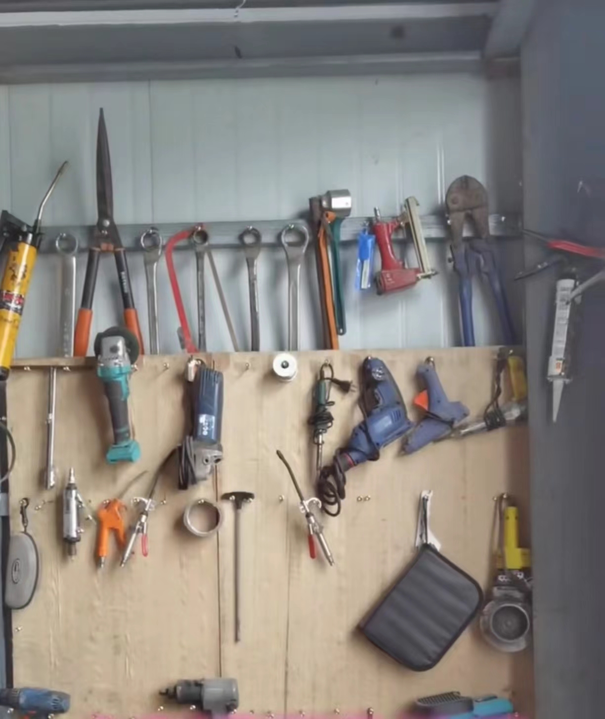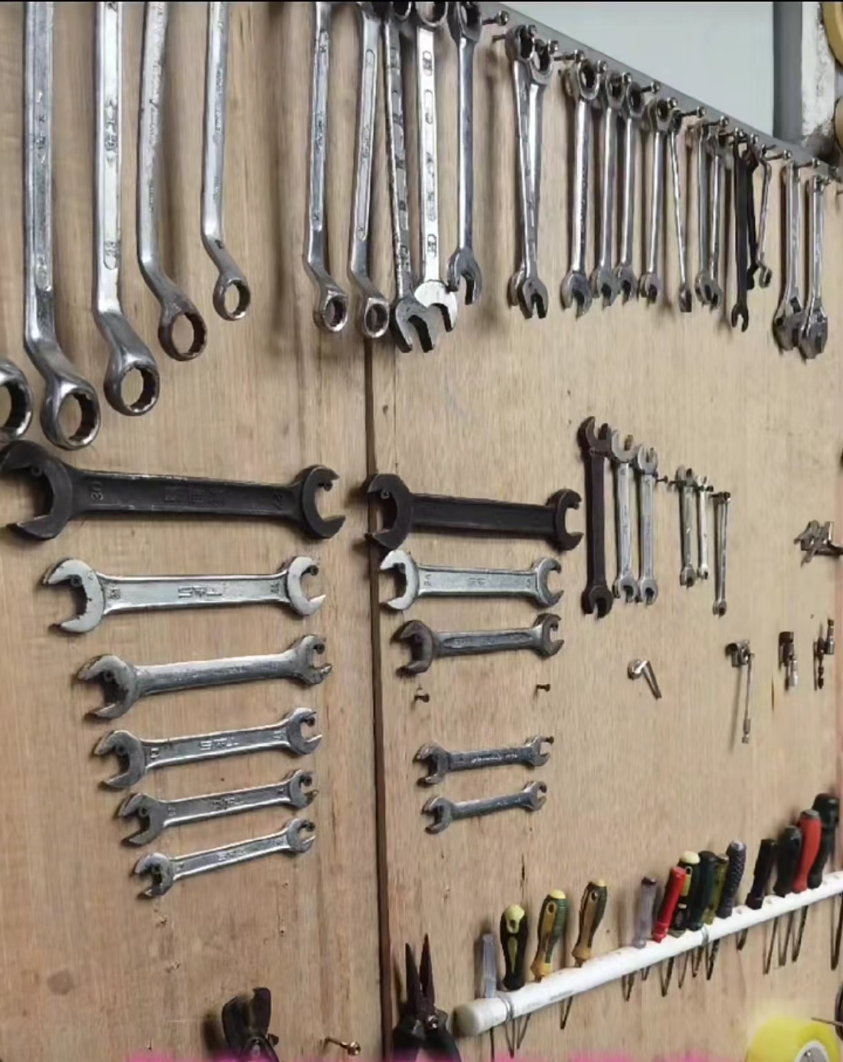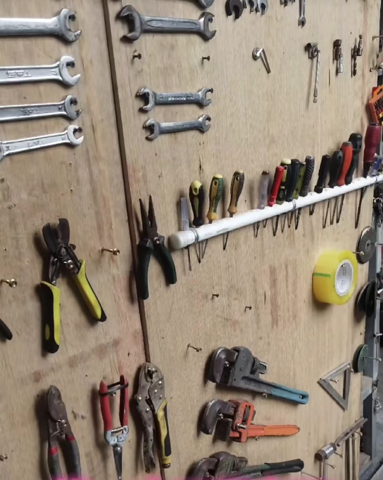 第1点,正如图片中把工具房的墙面贴上木板,根据工具的大小两边钉上钉子,刚好工具能挂上面,开口扳手、套筒扳手、六角扳手,大小型号的螺丝刀、尖嘴钳、老虎钳、拨线钳。型号由小到大都挂在木板上,使用时很容易辨认,拿起来的时候也非常顺手。