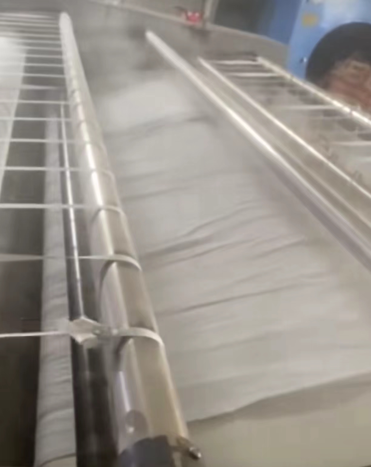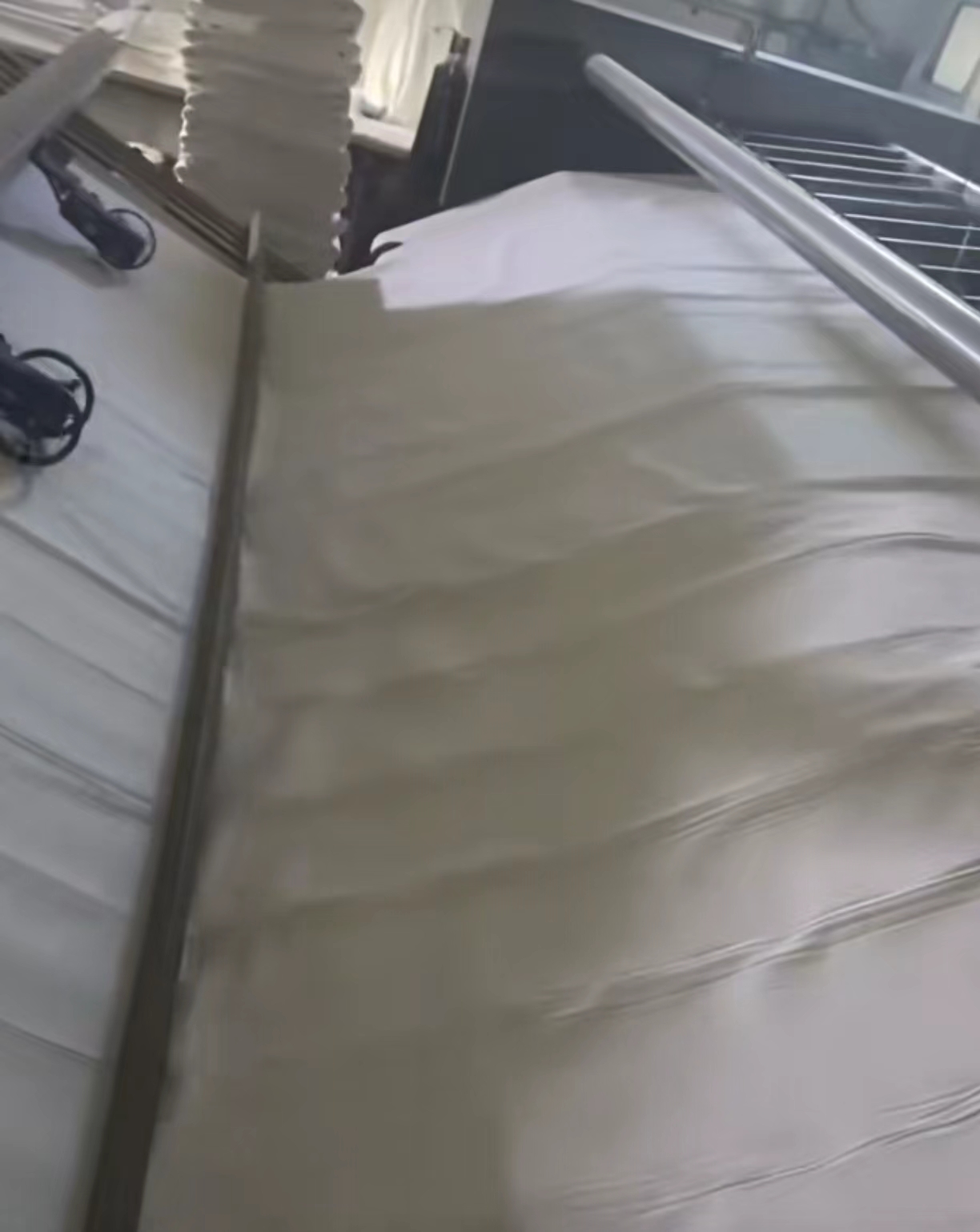 第3点你仔细看视频中不难发现,后滚进入前滚的同时,由于速差原因,把被套上拉起来一条一条的竖纹,还是由于布草含水率高,前滚压得比较紧,蹬得比较快,把后面蹬出来的竖纹。如果你的烫平机一开始就有这种情况,你就要考虑调整速差。如果以前没有这种情况,你要检查链条各方面松紧调整适中,降低布草的含水率即可。那么你还知道还有哪些原因也有可能引起这种竖纹的发生呢?不妨分享一下您的使用经历,我们一同探讨交流实践经验。