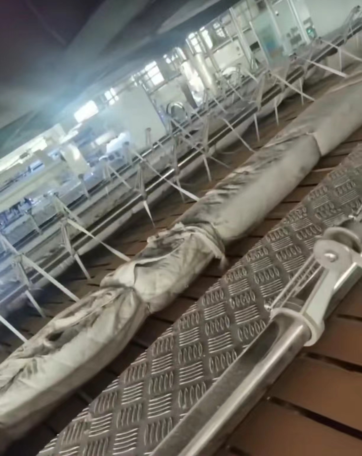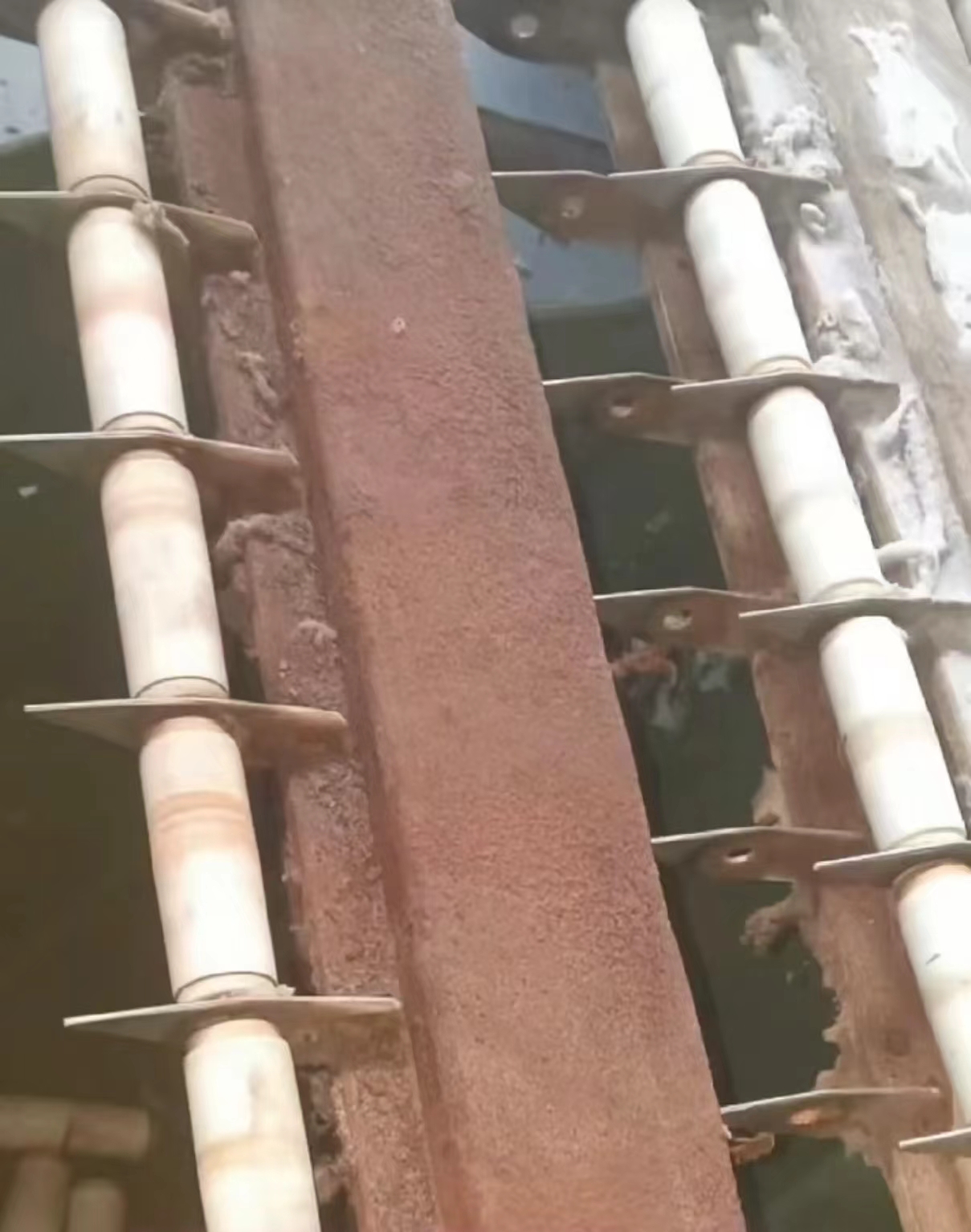 第3点,这一点是最关键的一点,特别是用年限已久的高速烫平机,尖刀轴后面,方管这个位置,特别是使用年限已久的高速烫平机。这里面如果你不经常打扫卫生,长时间积累灰尘,连同受潮的哈汽水积到一起,把方管给腐蚀掉。图片中仔细看,这是拆掉的尖刀轴后面的方管在冬季的时候,如果里面积累了哈气水和里面的灰尘堆积在一起,等到水分积累一定程度,就连同里面的锈水一起滴下来,滴到布套上,造成污染布草。你们觉得还有哪些原因也可能造成这种情况的发生呢?