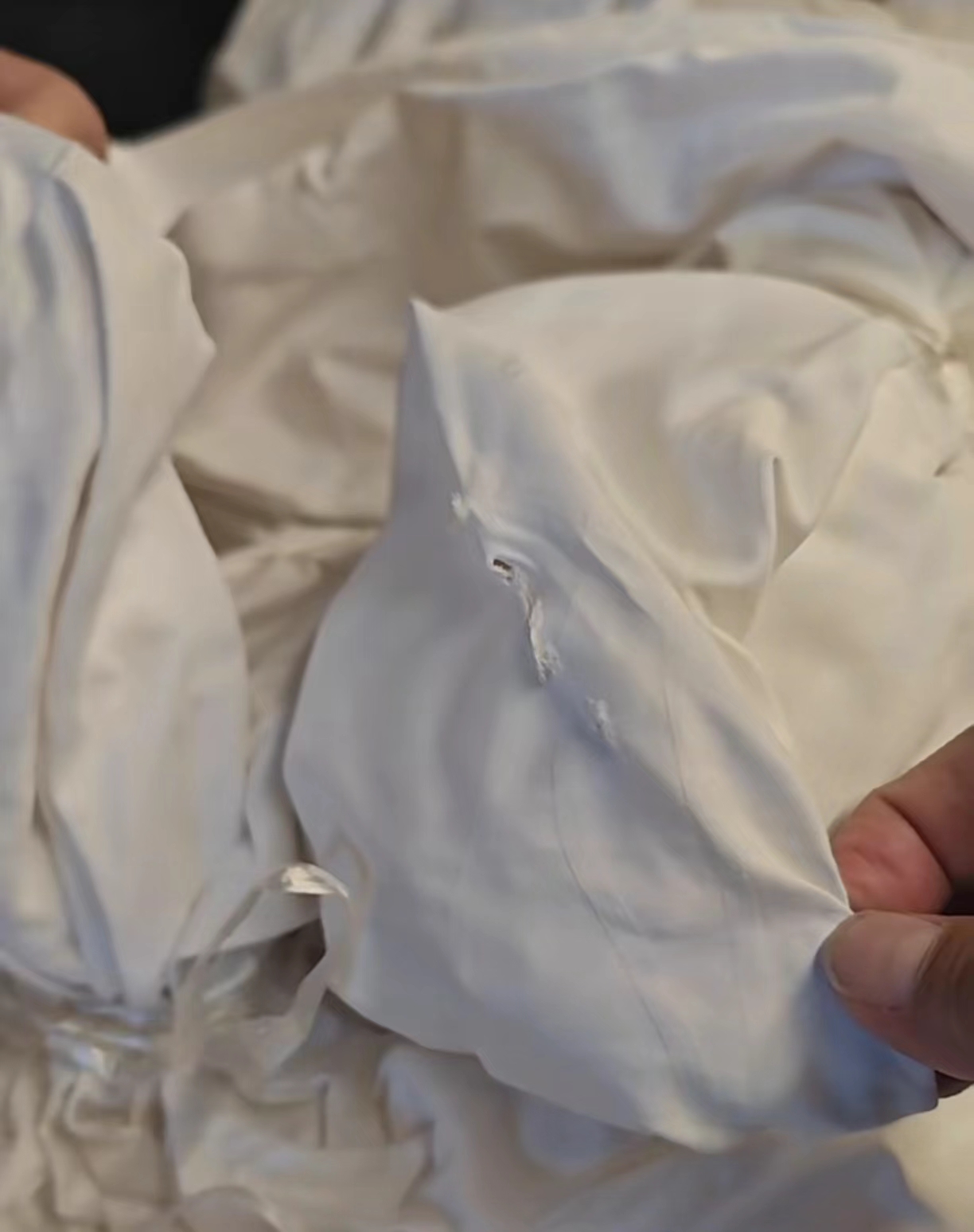 第1种,你仔细看图片中,如果是出现这种三尖口子的破损,如果是个例,有可能是在运输过程中、搬卸过程中挂破的。如果是大批量的,并且很有规律的,总在某一个位置附近,那你就把布草打开看看,在烫平机或者折叠机哪个位置,你顺着这个位置的附近看看哪里有没有凸起的硬物造成的刮破。