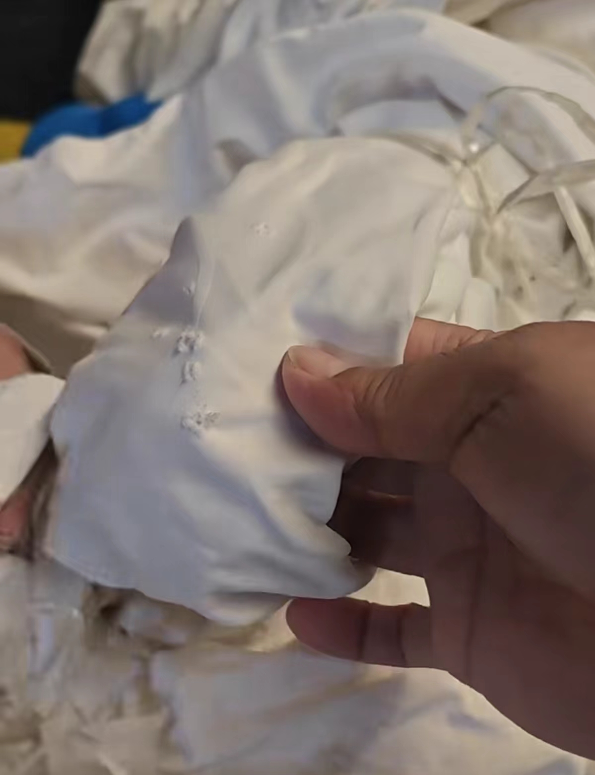 第2种如果破损,像星星点点的一些小圆洞形的破损,时不时有几条洗出来是图片这样,那你首先要检查前端有没有特殊处理,用药水这里点点,那里点点产生的,可能点过当天洗涤没有烂,过一段时间就会破损一个洞。或者你是用粉体化料使用单机洗涤,加料的时候师傅有没有把门打开,把化料撒到布草上,把布草造成腐蚀,洗几次,慢慢沾到化料的部分,就产生一个小洞洞,造成的破损。你想了解更多有关布草破损的原因吗?